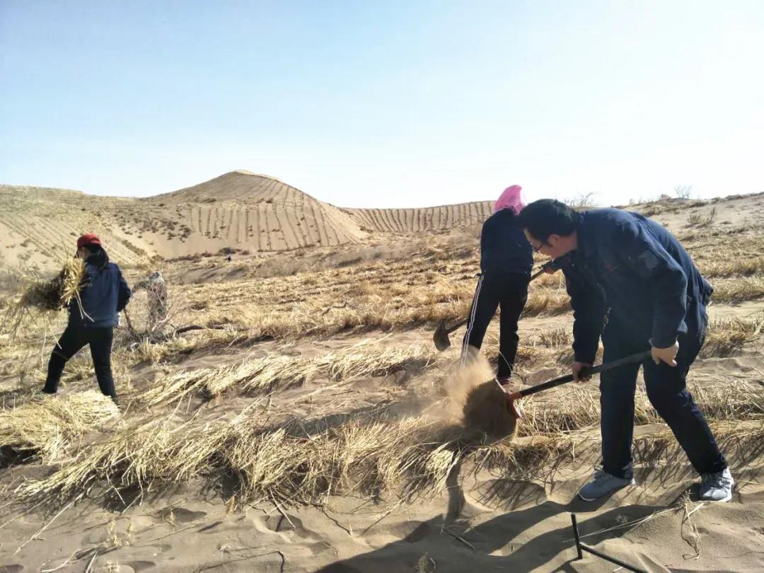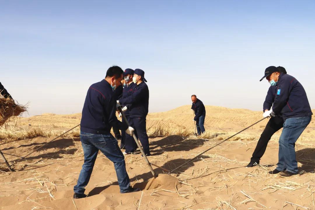 一大早,职工们在皇台酒业总经理杨利兵的带领下,精神饱满地赶赴至凉州区荣生路红水河荣华大桥向东21公里处的治沙现场。