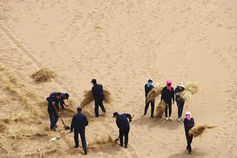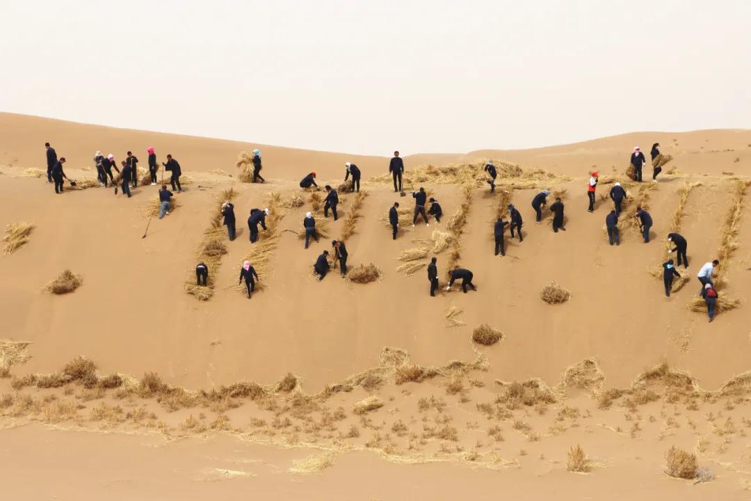 经过了一整天的辛苦劳作,可谓战果满满, 整齐划一的“草方格”, 从大家的脚底下延伸至远方,像一道道迷人的风景。无数的“草方格”,形成了成片沙障,将在这广袤的沙海中,与风沙牢牢抗衡。