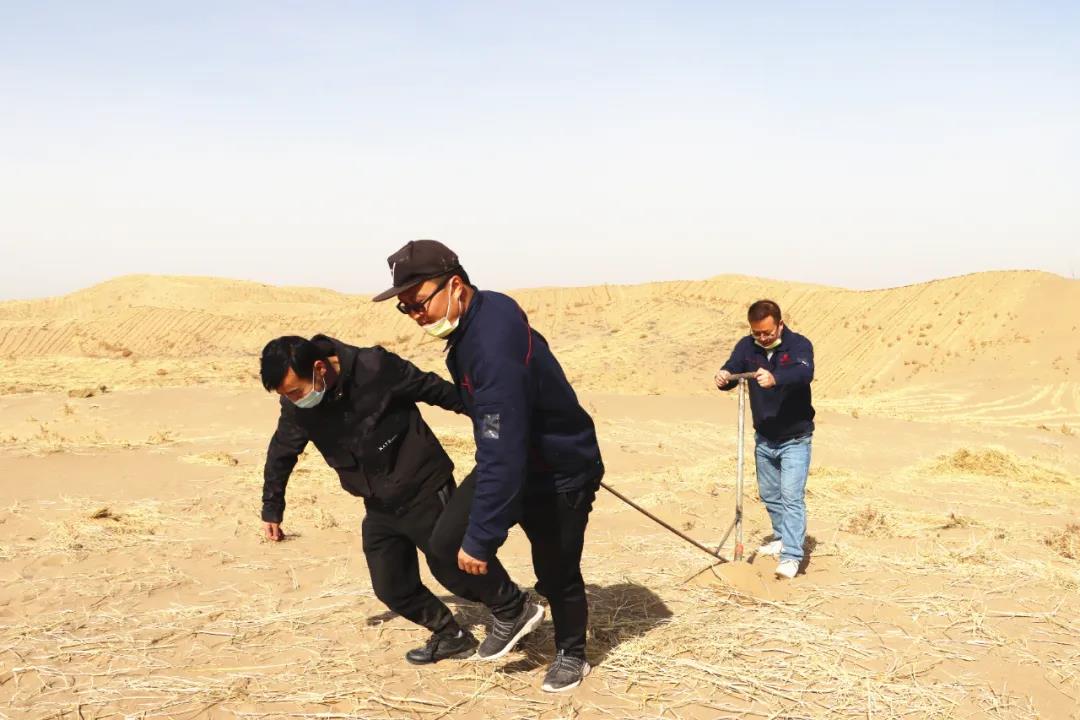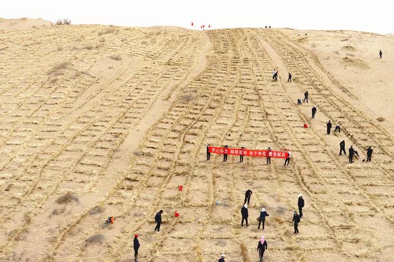 “压沙前,先要在沙丘上按设置方向、间距或网格划好设置线。背风坡,压竖道;迎风坡,就要横竖格子全压。先开宽25厘米、深20厘米的沙沟,将稻草在沙沟上均匀无间断铺好,再将沙子压实在稻草中间,将两边翘起的稻草用沙淤起与沙面垂直,扶成“双眉式”……大家仔细聆听了区林草局技术人员的详细讲解和指导后,很快掌握了规范的压沙方法和要求,各小组迅速投入到热火朝天的防沙压沙活动中。