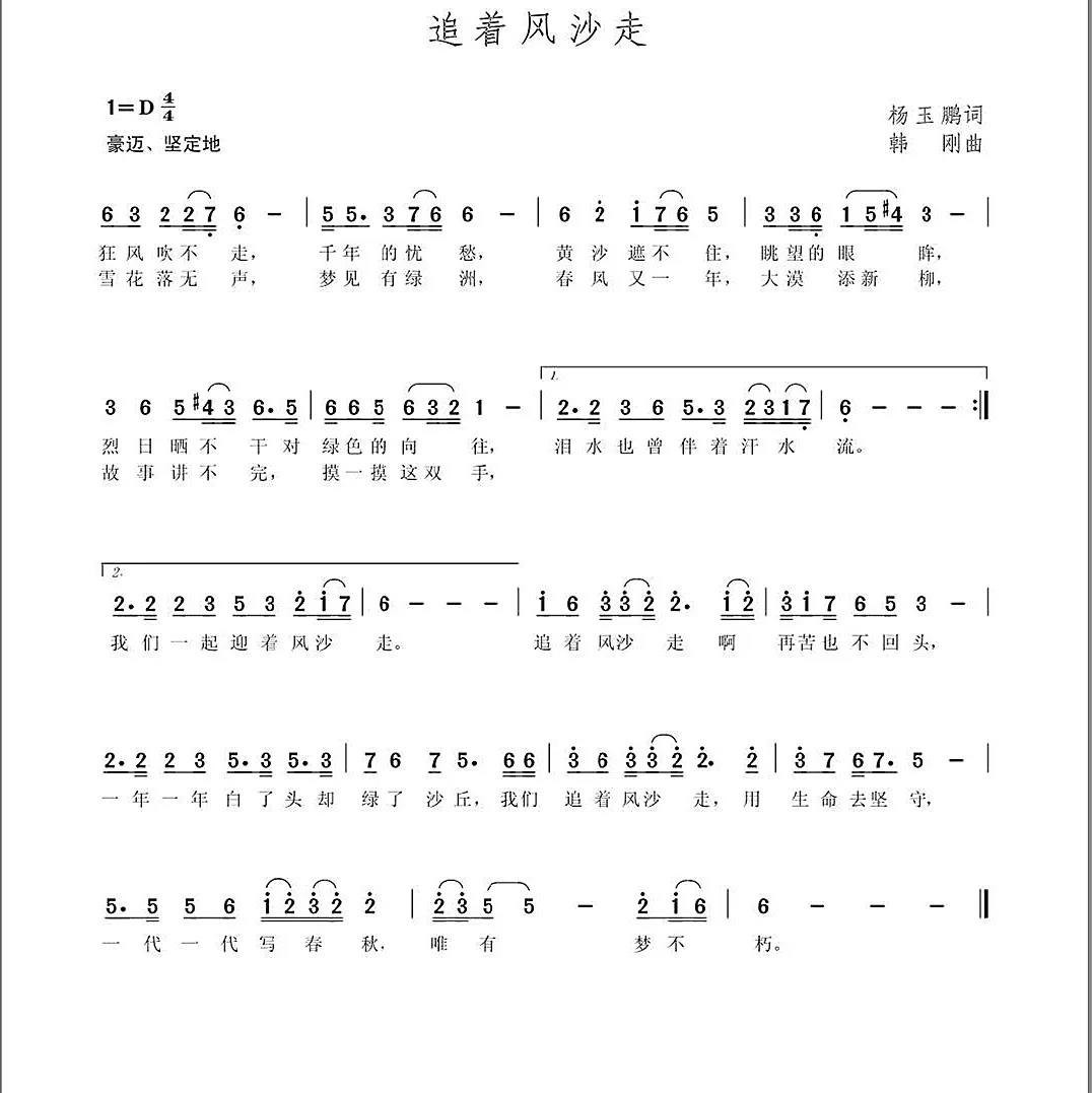 (一)《追着风沙走》:作词,杨玉鹏,青年词作家,甘肃武威人。代表作品:《甘肃老家》(印青曲)、《土豆花儿开》(韩刚曲)等。
