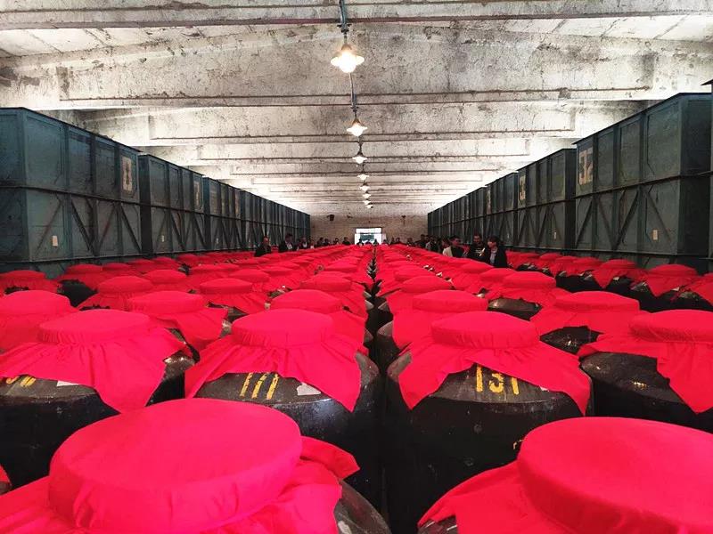 大家在半成品酒库参观大如草房子的酒海子,品尝贮藏了三十多年色泽微黄、香气扑鼻的老酒。