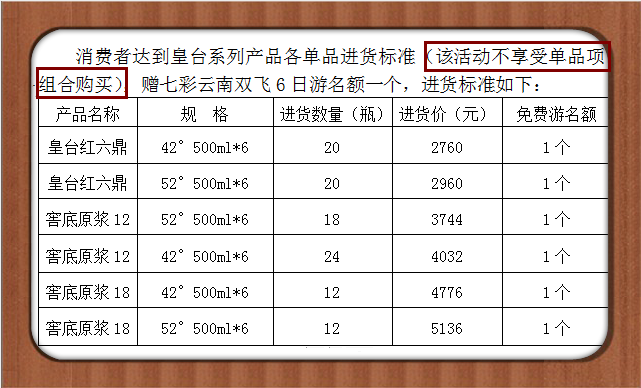 各位亲,不论您是婚宴喜事,还是乔迁新居;不论是商超进货,还是好酒收藏……只要您进购以下同等价值的皇台美酒,即可获得一场说走就走的七彩云南双飞6日游的美好之旅。
