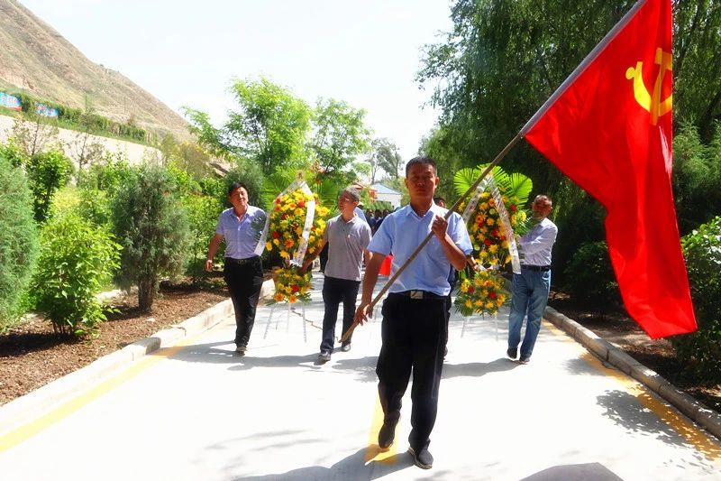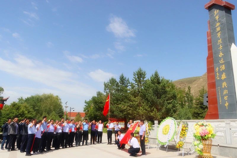 古浪西路军烈士陵园内绿树葳蕤葱茏,气氛庄严肃穆,初心广场中心雕塑“西征号角”巍然屹立。全体党员佩戴党徽、整齐列队,神情庄重。