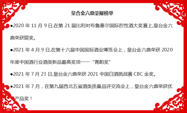 西北五省(区)协会于 2021 年 7 月 17—20 日在新疆维吾尔自治区喀什市召开了“西北五省(区)第九届酒类质量品评交流会”,在此交流会上,皇台窖底原浆18和皇台金六鼎分别捧获优质产品奖和优秀产品奖!