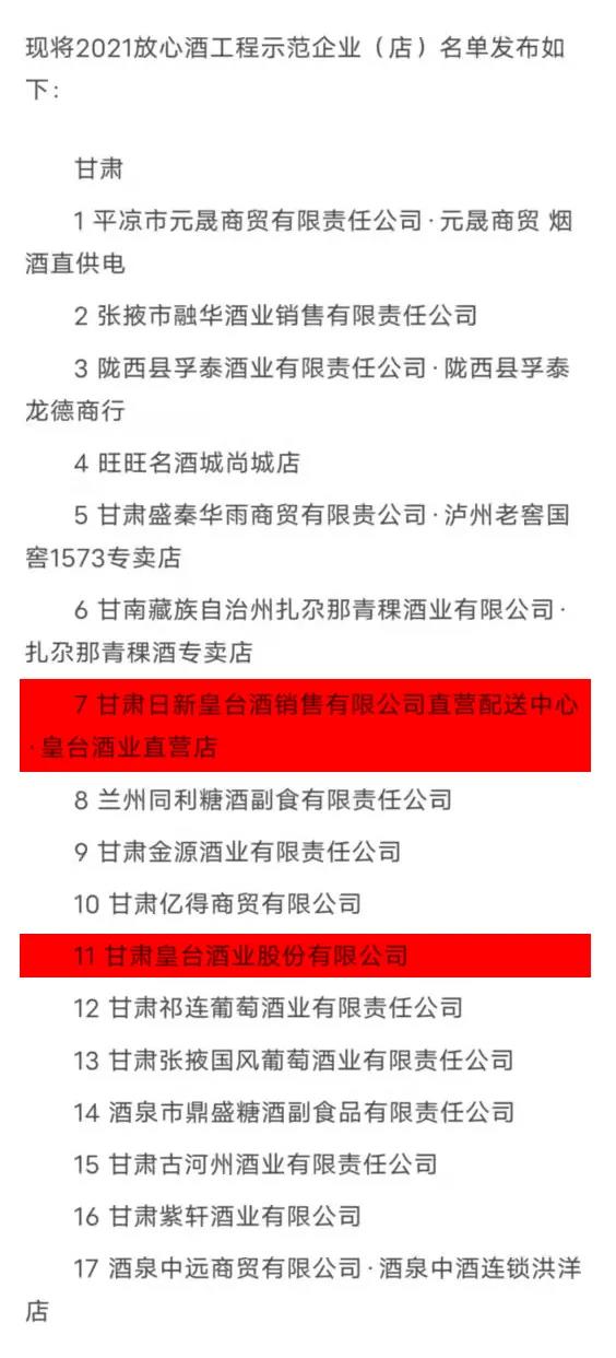 12月中旬,2021中国酒类流通酒类流通协会放心酒工程示范企业(店)名单发布,甘肃皇台酒业股份有限公司和甘肃日新皇台酒销售有限公司直营配送中心·皇台酒业直营店双双荣登2021年中国酒类流通协会放心酒工程示范企业(店)荣誉殿堂。