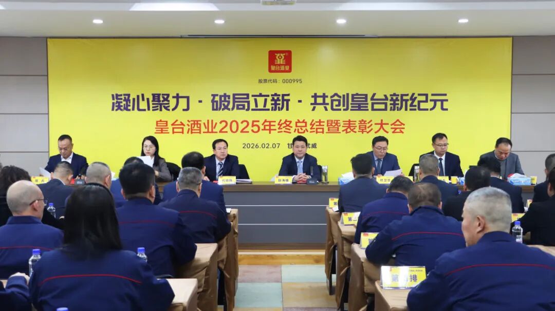 2026年2月7日,甘肃皇台酒业股份有限公司召开了2025年度工作总结暨表彰大会。皇台酒业董事长赵海峰、总经理修卫华、副总经理代继陈、副总经理杨利兵、财务总监刘会平、副总经理兼总工程师陈兵、副总经理兼董事会秘书项新周,以及各销售公司负责人、副总经理、区域经理及业务员代表,各部门管理人员及员工代表,销售之星、先进个人及先进集体代表等齐聚一堂,共同回顾2025年的发展历程,携手擘画2026年的发展蓝图。公司经营班子领导分别就各自分管工作进行了年度总结述职;大会对2025年度工作中涌现出的年度销售之星、先进个人及先进集体进行了表彰奖励;最佳业绩团队及先进代表在大会上进行了表态发言;在公司所有与会代表的共同见证下,总经理修卫华与子公司负责人、公司副总签订了《2026年度经济目标责任书》。