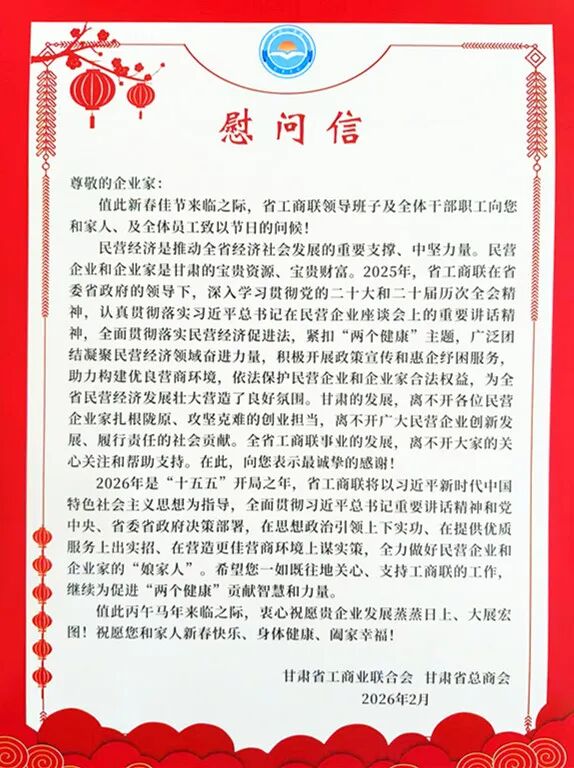 在走访过程中,毛赟与皇台酒业相关人员亲切交流,详细询问了企业当前的生产经营与发展情况,并送上4万元“送温暖”新春慰问金,同时向大家致以新春祝福。毛赟强调:民营企业是甘肃经济发展不可或缺的强有力支撑,甘肃的发展,离不开广大民营企业创新发展、履行责任的社会贡献。省工商联始终高度关注民营企业的成长与发展,会一如既往地发挥桥梁纽带作用,积极为企业排忧解难,营造更优的营商环境,助力包括皇台酒业在内的广大民营企业在新的一年里稳健发展、再创佳绩。胡勇也表示,市工商联将与省工商联紧密联动,全力支持皇台酒业等本土企业深耕主业,推动企业在技术创新、品牌建设等方面取得更大突破,为地方经济社会发展贡献更多力量。